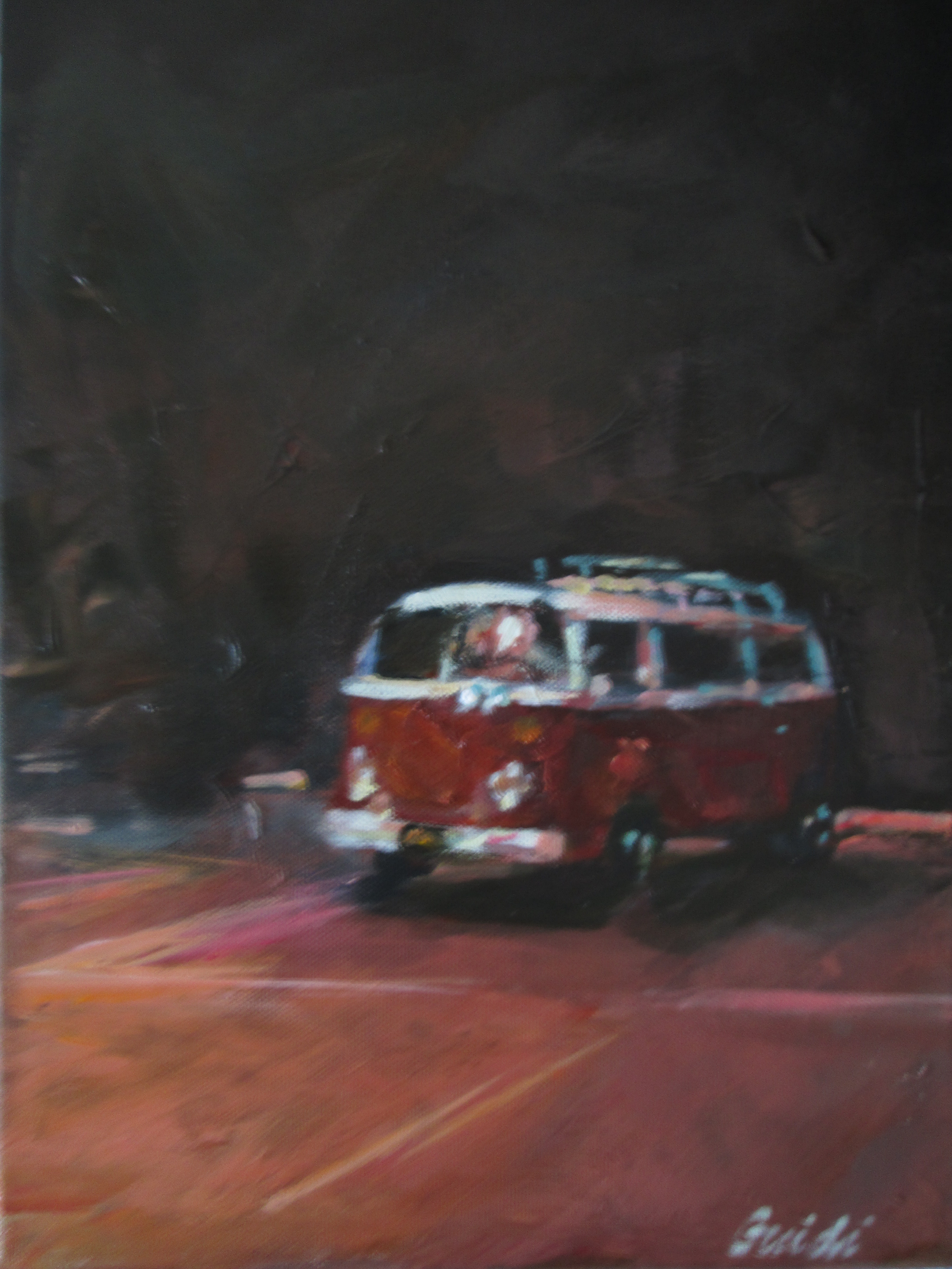 9″ x 12″ acrylic on canvas.My Mom and I were at a local market a couple of weeks ago .We had just parked and about to go in when I noticed this wonderful classic red VW bus parked just a ways away.With the dark night back round juxtaposed with the lights and color of the bus sitting alone there on a parking space,I grabbed my mobile and took a few photos.